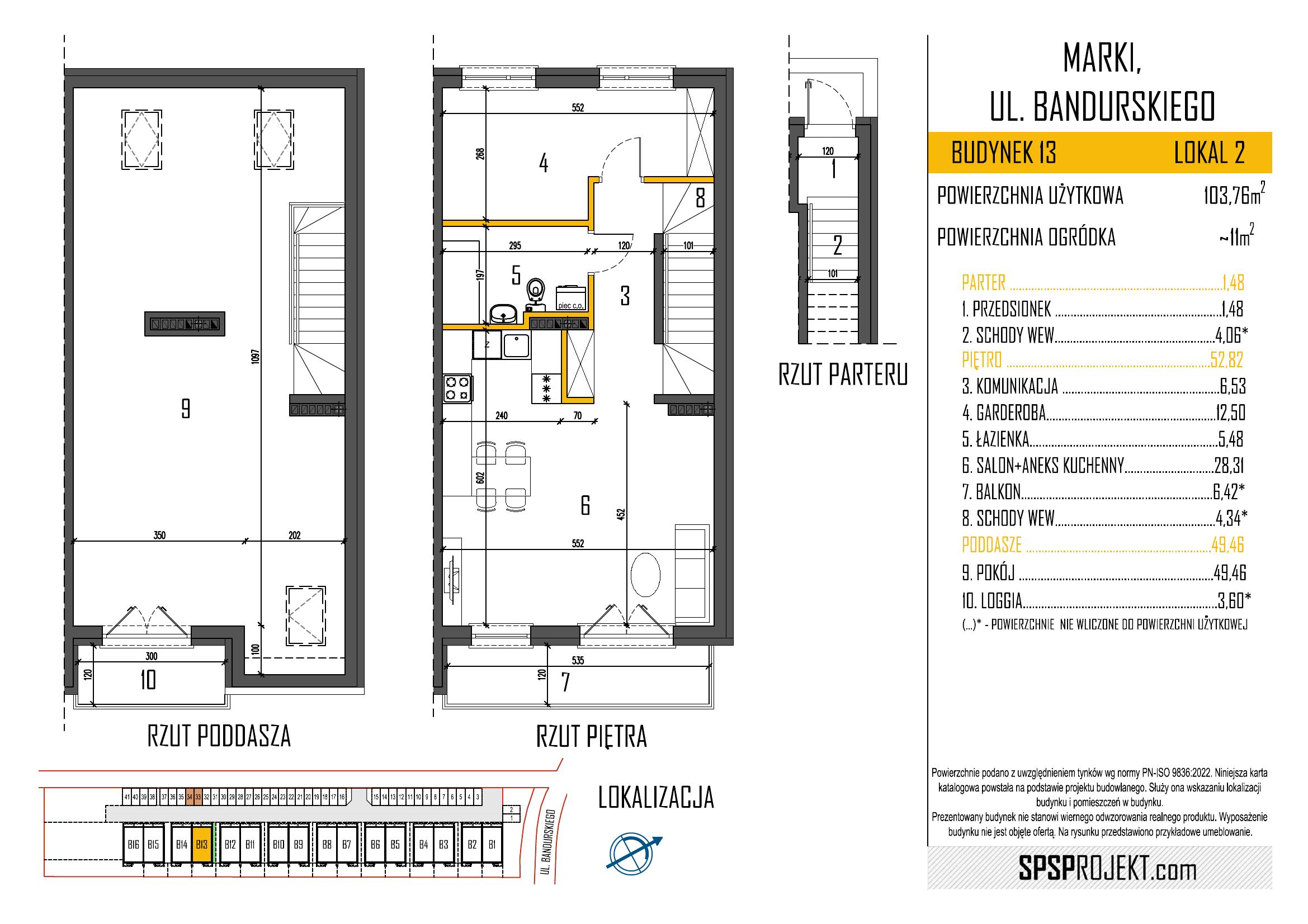 | Marki, ul. Bandurskiego 49P, Budynek 9 | Piętro 1+Poddasze | 2 | 103.76 | 11 | 6,42+3,60 | 4+aneks | 2MP naziemne 0 zł | więcej informacji | |||